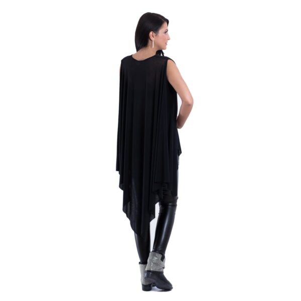 Bluza din jerse negru. O croiala simpla, cu linii fluide si falduri de material care se termina in colturi asimetrice. Poate iti doresti un look mai gothic sau vrei doar sa arati mai nonconformist, cert este ca aceasta bluza fara maneci, lunga, in combinatie cu niste pantaloni din piele si niste cizmulite pana deasupra gleznelor iti va oferi un look aparte. Doar de tine depinde cum le accesorizezi.
