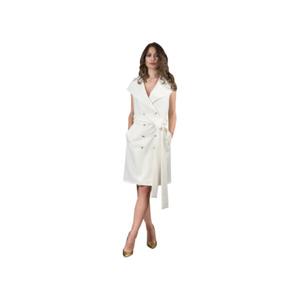 Rochie de zi eleganta, petrecuta in fata. O croiala inedita, lejera, cu guler larg, geometrizat, rasfrant si nasturi pereche. Cordonul lat accentueaza talia, nota geometrica fiind continuata prin cele doua buzunare oblice, utilizabile, de pe fata. Culori: alb, rosu, negru, verde smarald.