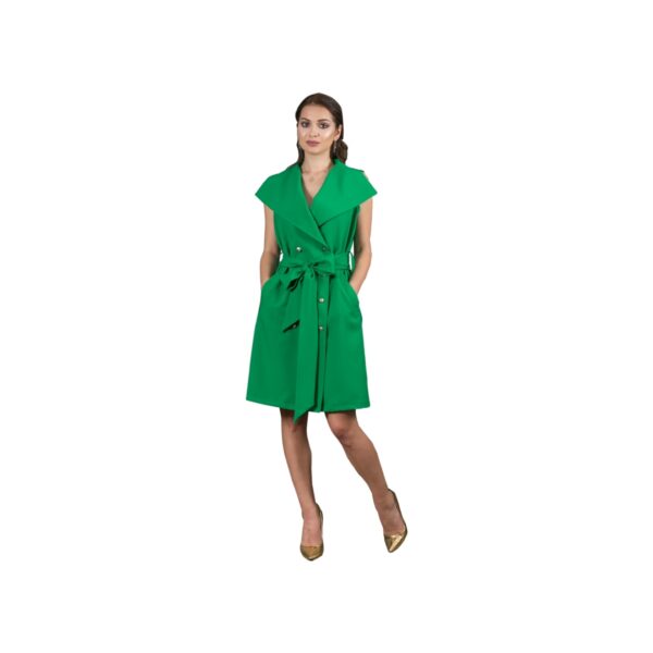 Rochie de zi eleganta, petrecuta in fata. O croiala inedita, lejera, cu guler larg, geometrizat, rasfrant si nasturi pereche. Cordonul lat accentueaza talia, nota geometrica fiind continuata prin cele doua buzunare oblice, utilizabile, de pe fata. Culori: alb, rosu, negru, verde smarald. MATERIAL: vascoza 95%, elastan 5%